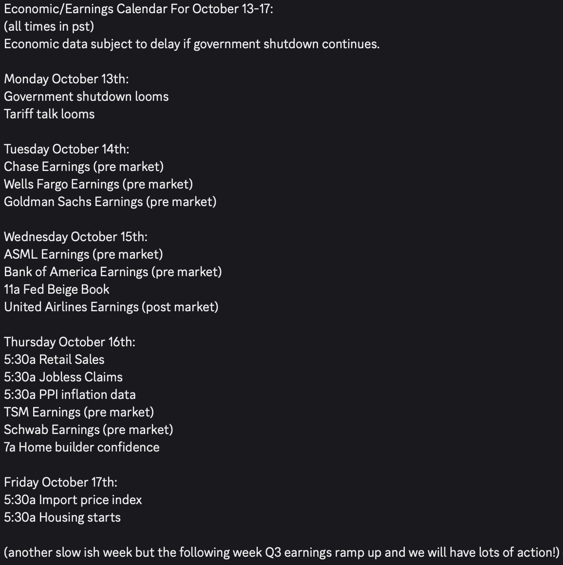 Q3 earnings fire up and we will get lots of catalysts and clues into he state of the economy, companies, tariffs, inflation, valuations, guide, Ai, Cap ex, ect…
