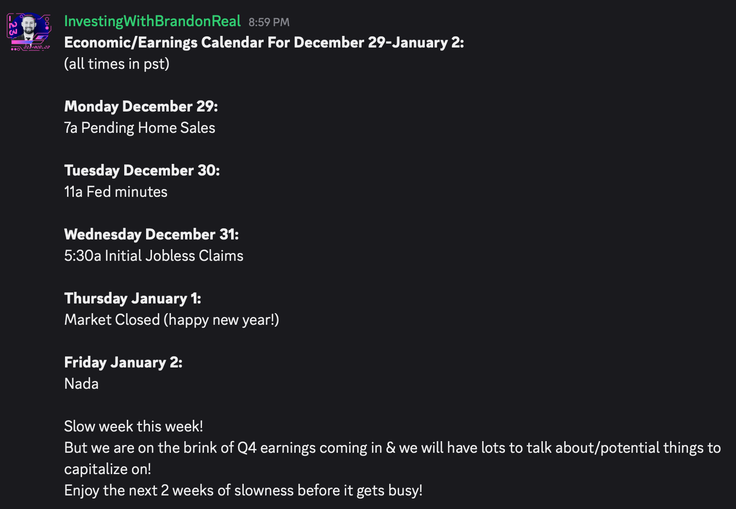 Next week will also be a slow week in the market, but after that we get Q4 earnings & lots of economic data dropping. I will be breaking all of this down in Discord in real time.