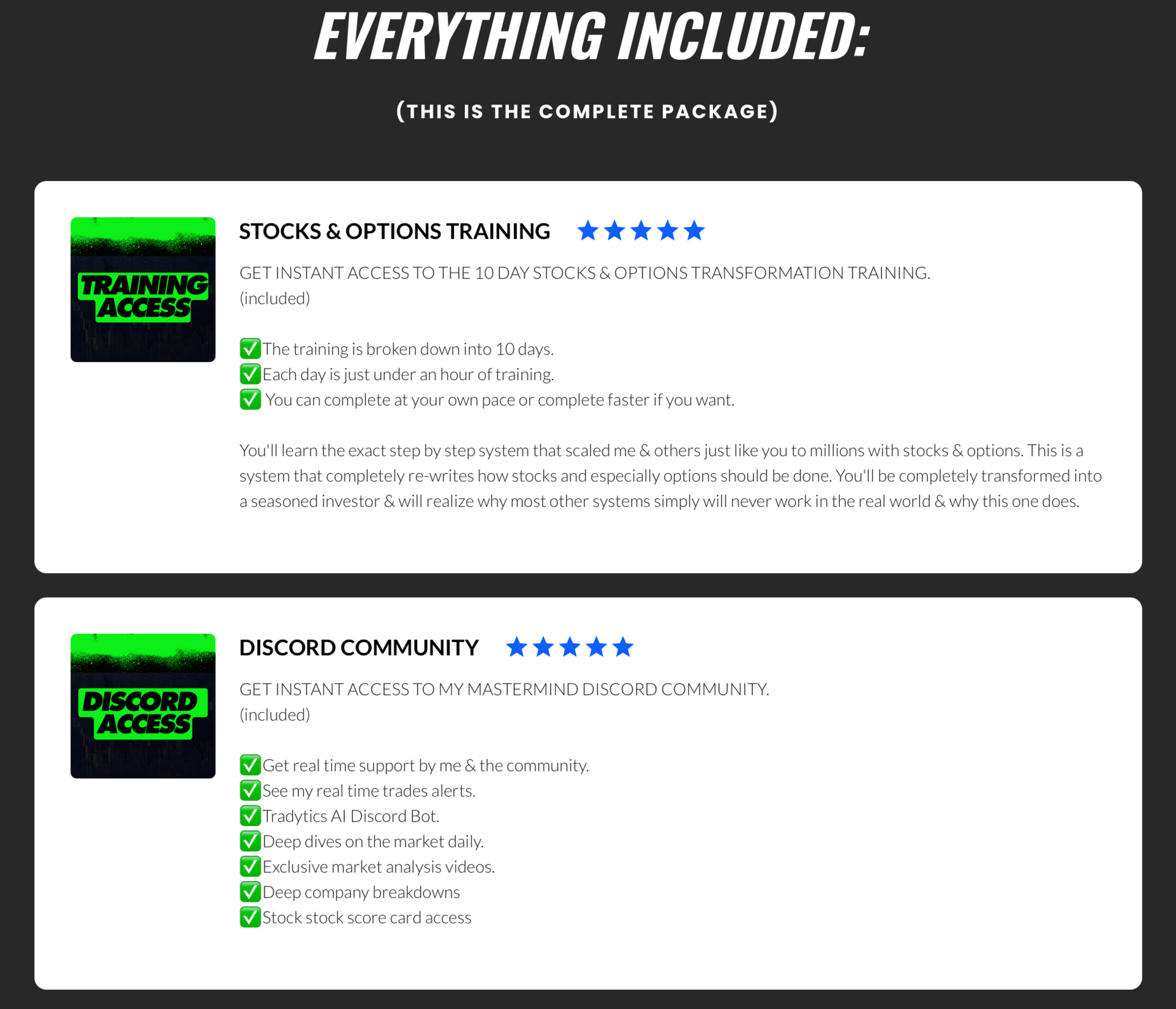 Over the course of 10 days of training (you can finish faster if you want), you'll learn exactly how you can scale your portfolio to millions with Stocks & Options in a low risk way & get access to my mastermind Discord community.