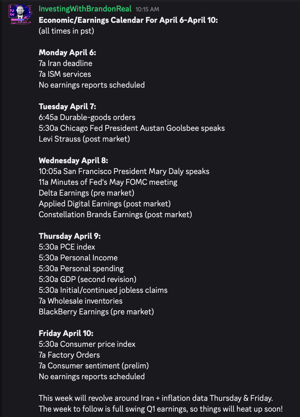 Next week is a data-heavy week. No major earnings yet, but Q1 earnings season fires up the following week with the banks and TSM. That's when things get really busy in Discord.