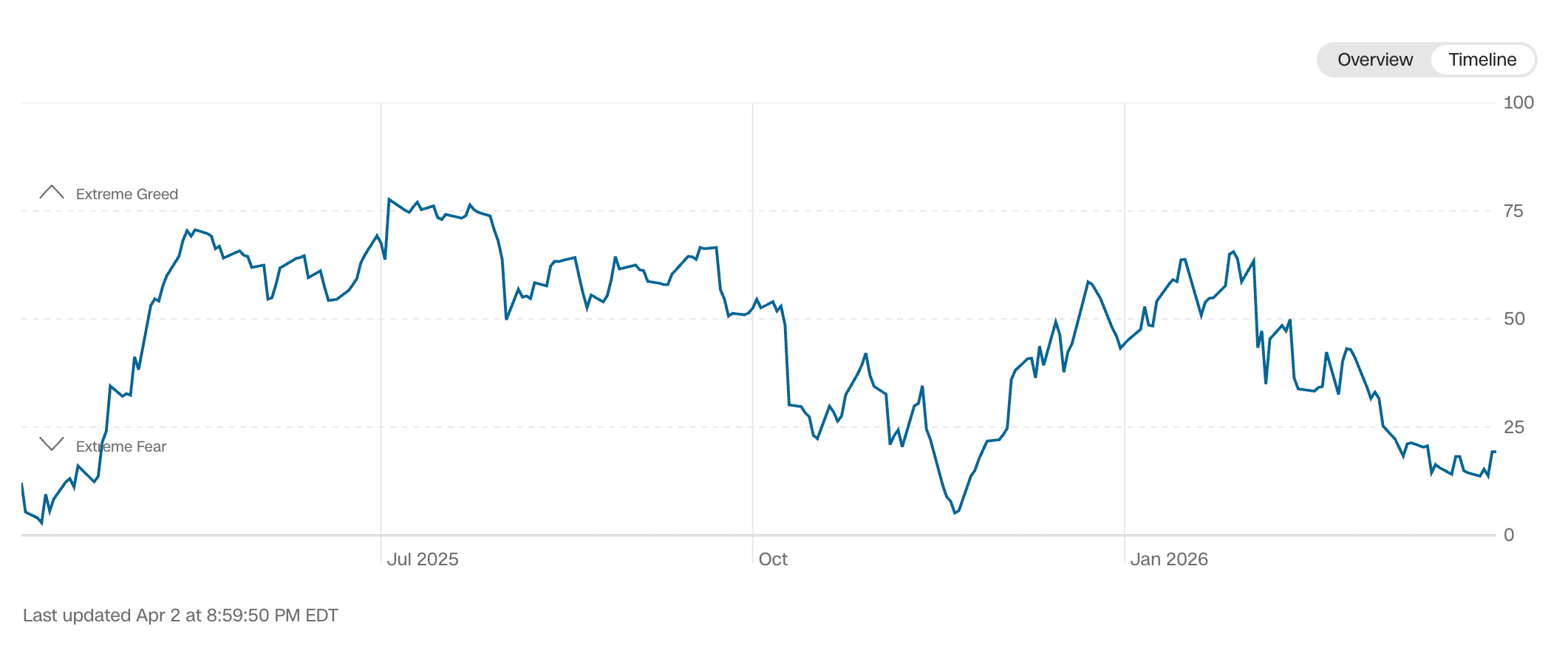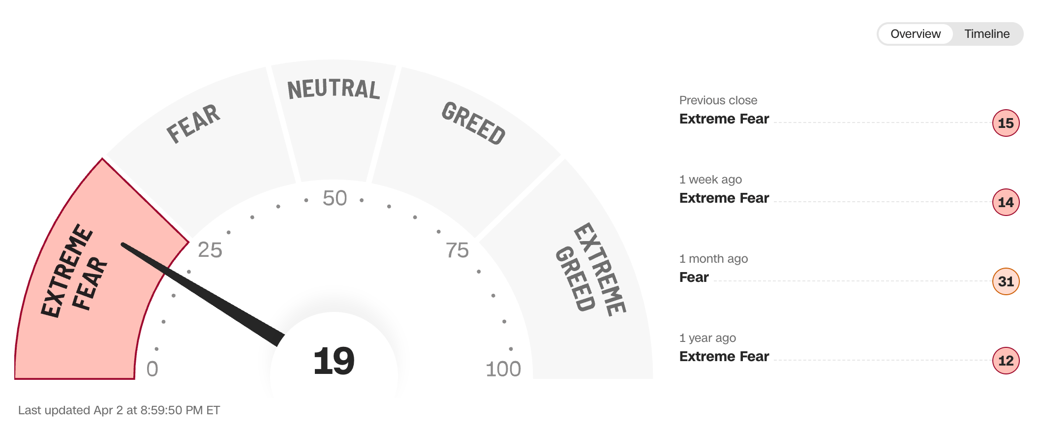 Current read is 19 on the fear greed index vs 10 last week.