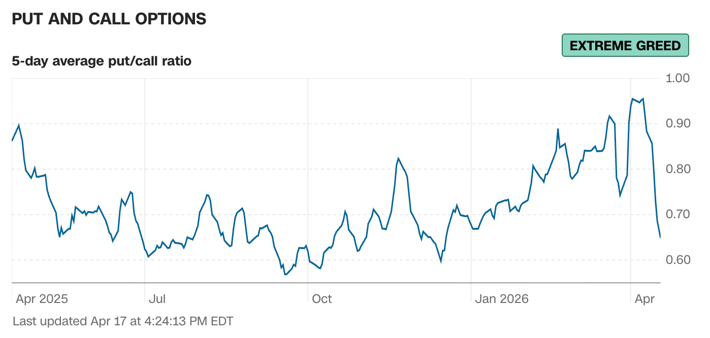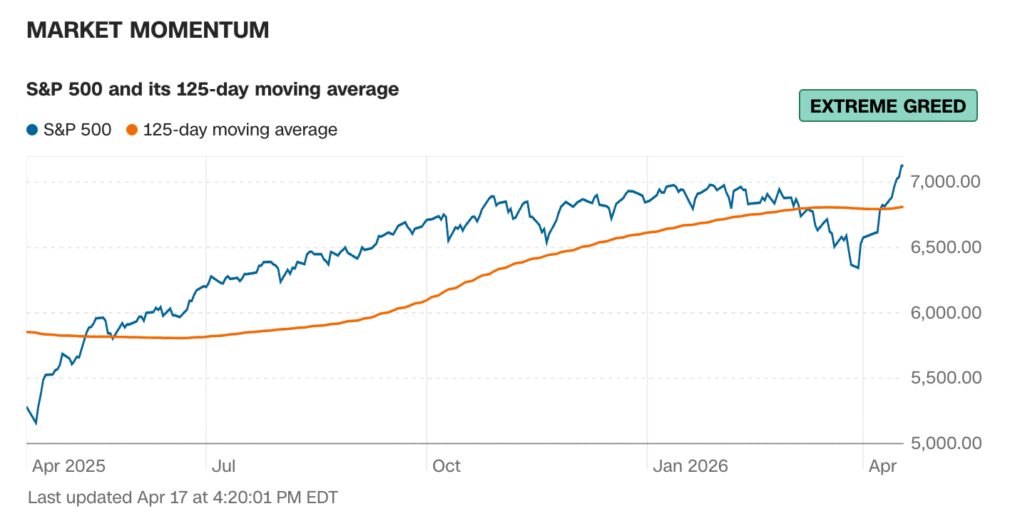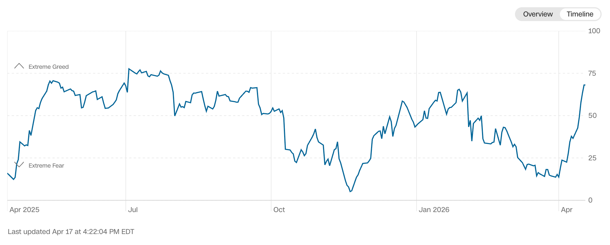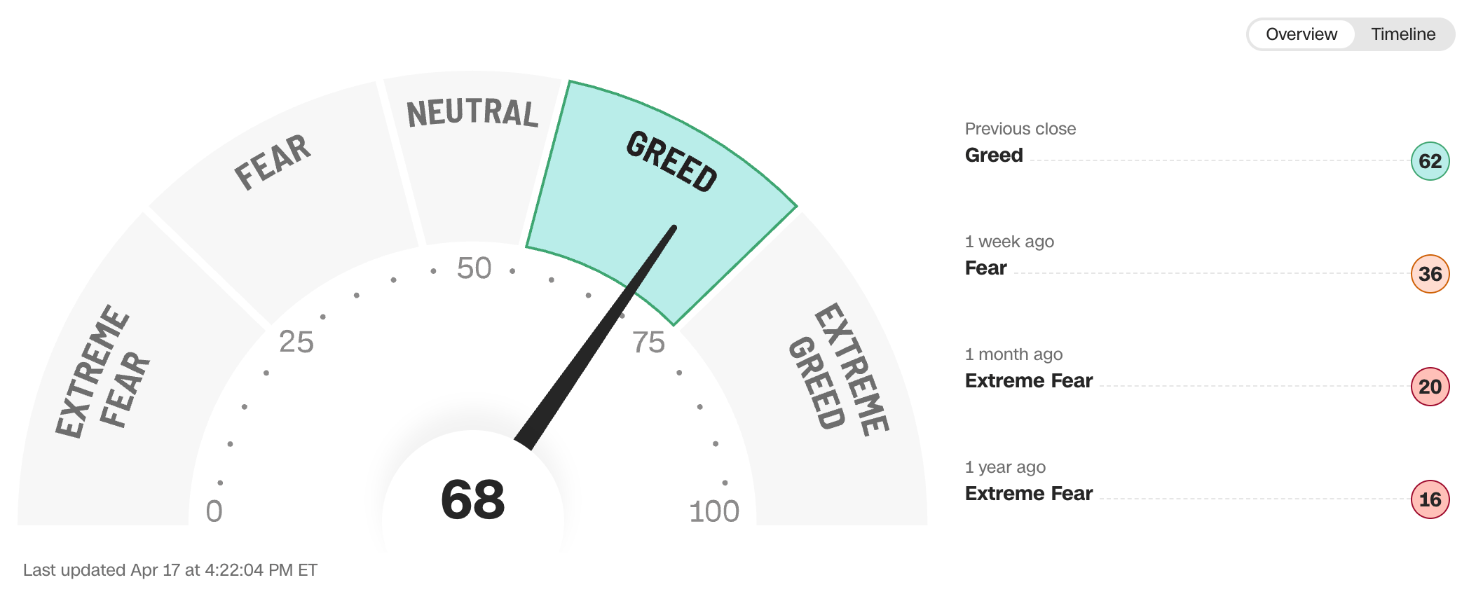 Current read is 68 on the fear greed index vs 38 last week.