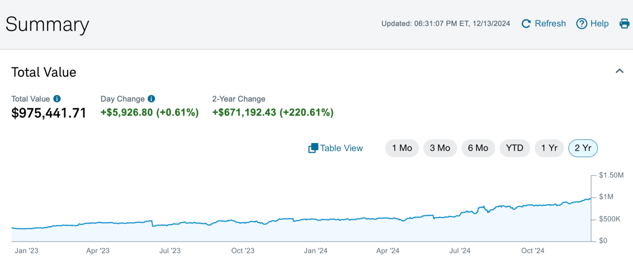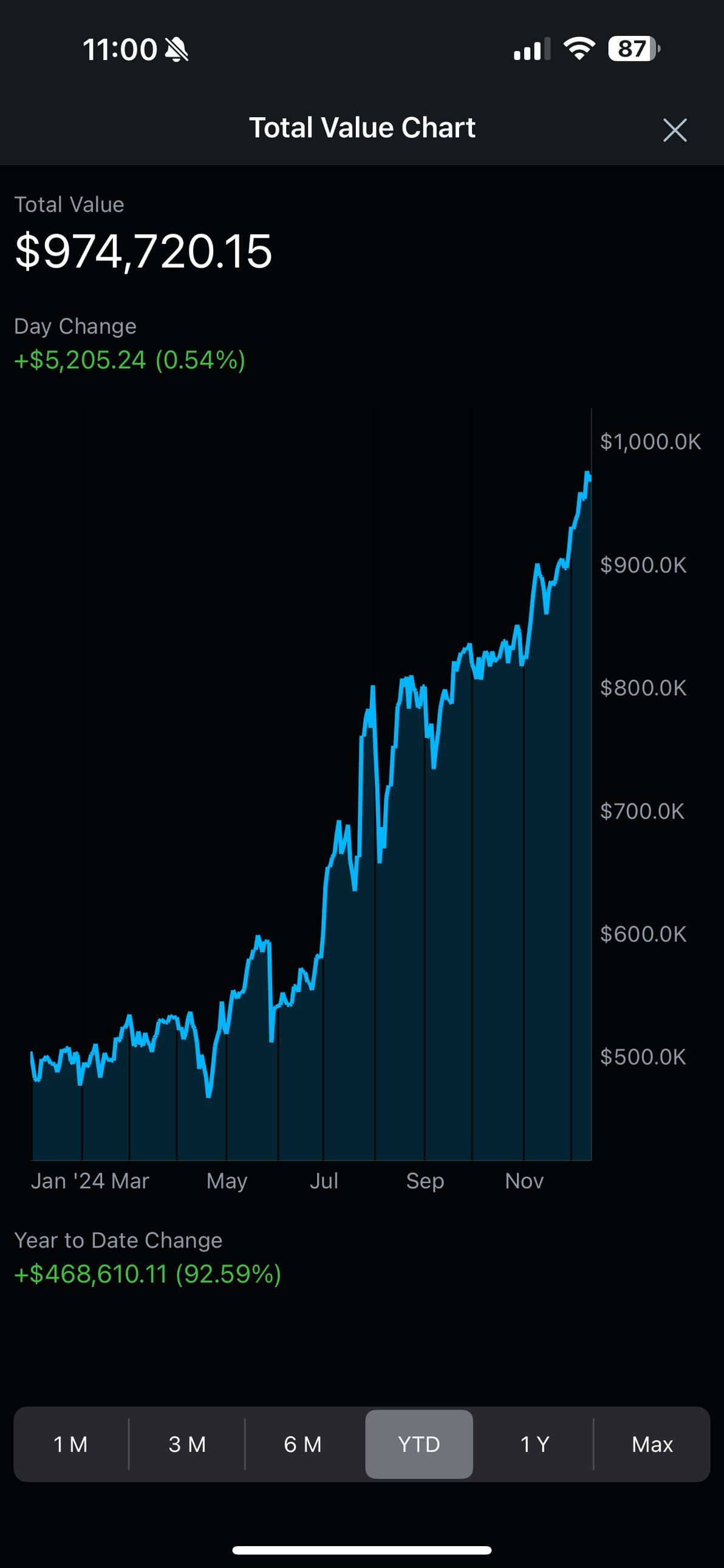 NUMBER 4 - Short term the market is a voting machine. Long term the market is a scale. The stock movement short term is fear and greed. Long term the companies get put on a scale and the weight is checked. That is when the true intrinsic value is reflected in the stock price. This is when things correct higher or lower. So right now yea things are easy now, but it will not always be like that. FYI, I am not bearish, I am ultra bullish America in the long run, but valuations are a tad lofty now so that is what I am being cautions. Yea cautions and still did 92% return this year haha. Some years I may be down 30%+ cause the market is too! Not every year will be green and if you can’t stomach that, you gotta be in another business. I am an investor that used options to magnify returns on high confidence plays. That is it. Look at my portfolio values below during 2022 when the market dipped. I was flat ish. I was positioning myself to capitalize on the next bull run. Look at the explosion in value in my trading account since then….