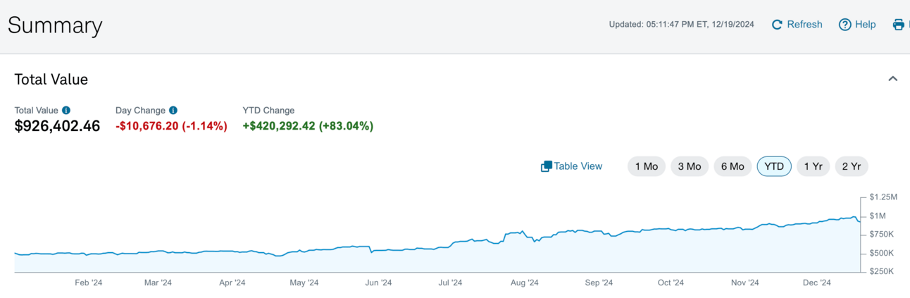 I started this year at $506,110. Currently $926,402. This is the power of doing stocks and options the right way but I do expect more volatility. I am being very cautious with options right now. I consider this account to be worth around 750k for the true intrinsic value. Not 900k+ Which means I wouldn’t be surprised if we dip more!
