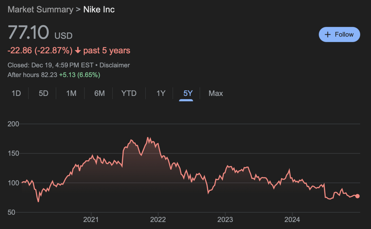 Moat, Pricing power, durable competitive advantage, cheap vs intrinsic value, ect... Nike does not have that in my opinion.