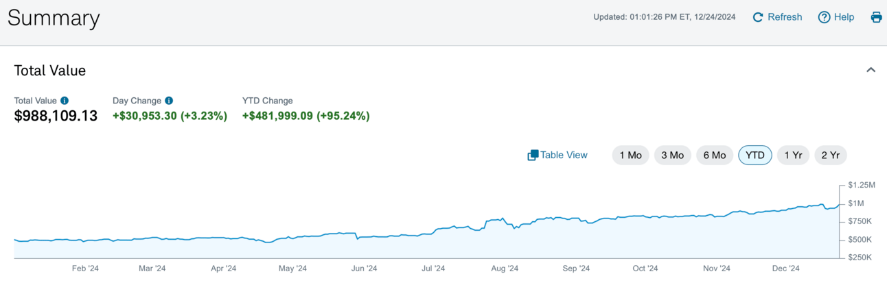 I started this year at $506,110. Currently $988,109. This is the power of doing stocks and options the right way but I do expect more volatility. I am being very cautious with options right now. I consider this account to be worth around 750k for the true intrinsic value. Not 900k+ Which means I wouldn’t be surprised if we take a dip!