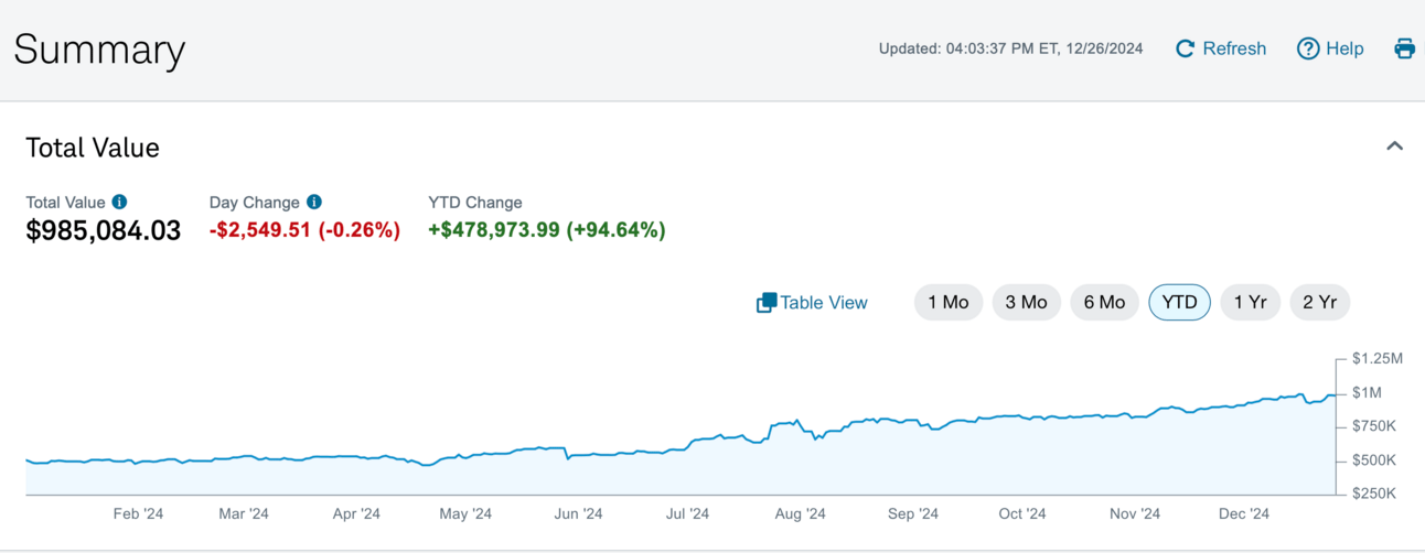 I started this year at $506,110. Currently $985,084. This is the power of doing stocks and options the right way but I do expect more volatility. I am being very cautious with options right now. I consider this account to be worth around 750k for the true intrinsic value. Not 980k+ Which means I wouldn’t be surprised if we dip more!