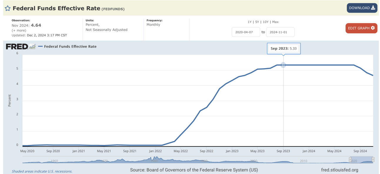 The chart below shows the most recent hiking cycle and the start of cuts.