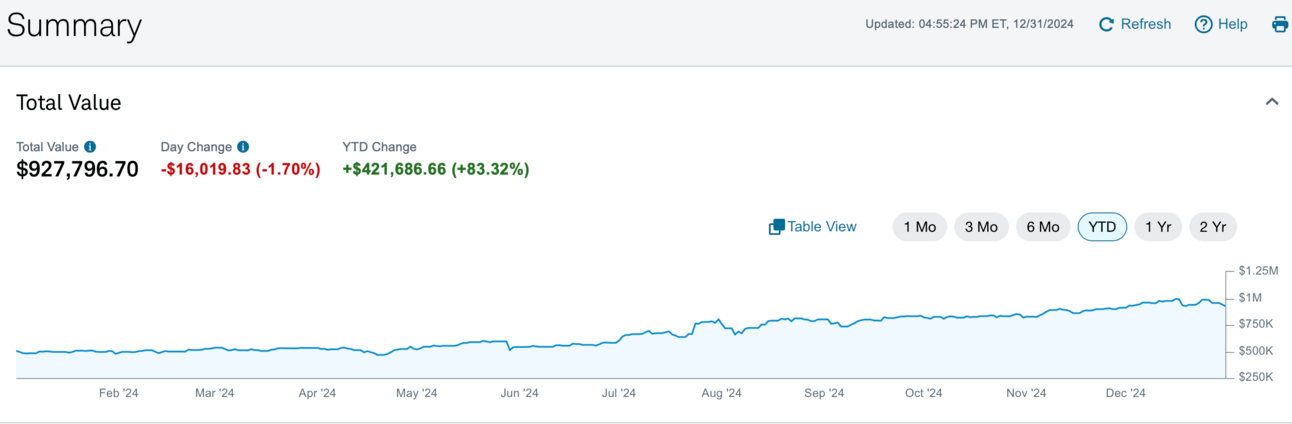 I started this year at $506,110. Currently $927,796. This is the power of doing stocks and options the right way, but I do expect more volatility. I am being very cautious with options right now. I consider this account to be worth around $750k for the true intrinsic value, not $900k+. This means I wouldn’t be surprised if we take a dip!