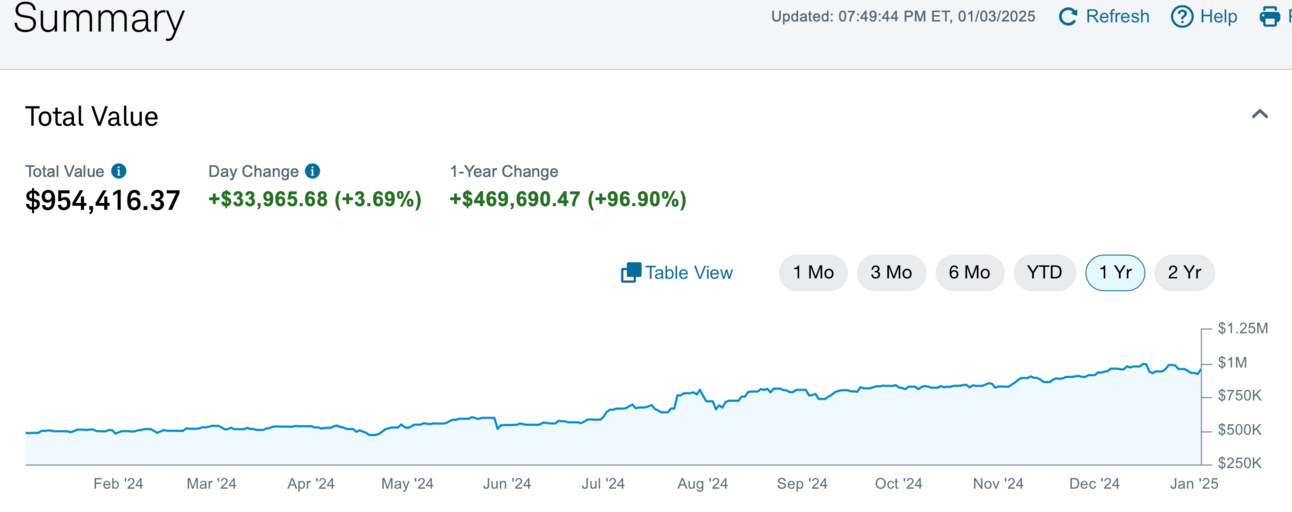 I started this account with $0 in 2018 & Currently $954,416. Total contributions of $90,000. This is the power of doing stocks and options the right way, but I do expect more volatility. I am being very cautious with options right now. I consider this account to be worth around $750k for the true intrinsic value, not $900k+. This means I wouldn’t be surprised if we take a dip!