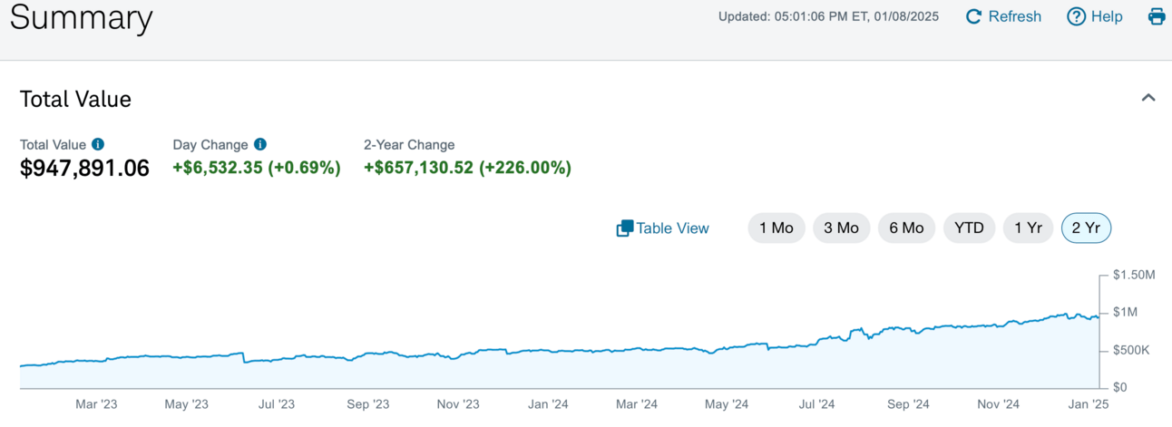I started this account with $0 in 2018 & Currently $947,891. Total contributions of $90,000. This is the power of doing stocks and options the right way, but I do expect more volatility. I am being very cautious with options right now. I consider this account to be worth around $750k for the true intrinsic value, not $900k+. This means I wouldn’t be surprised if we take a dip!