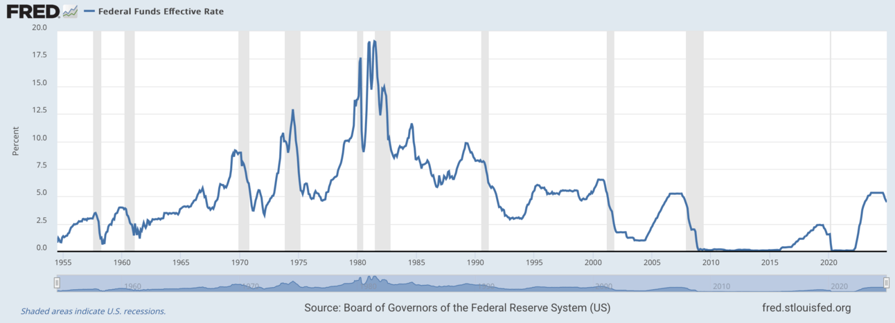 This is a chart of the fed funds rate since 1955. Even though we did raise quite a bit in recent years, we are still historically on the low side of average.
