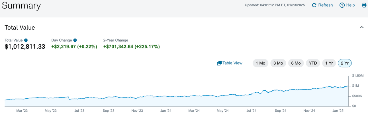 Screenshot from today. Just over a Mil. I do think the market is a little pricy so I would NOT be surprised if we pull back to $800k ish in this account. I am positioned to capitalize on upside and downside!