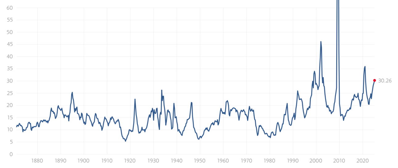 This chart shows the PE ratio of the S&P 500 on a trailing 12 month basis.
