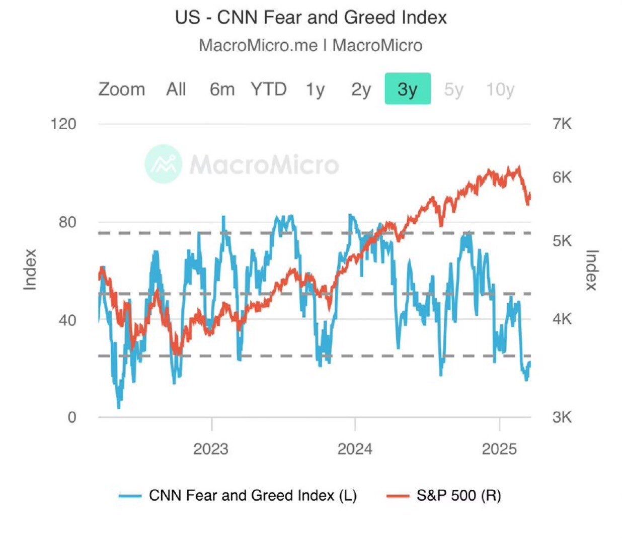 Notice how the market seems to bottom when there is peak fear… (lower number on blue line = more fear)