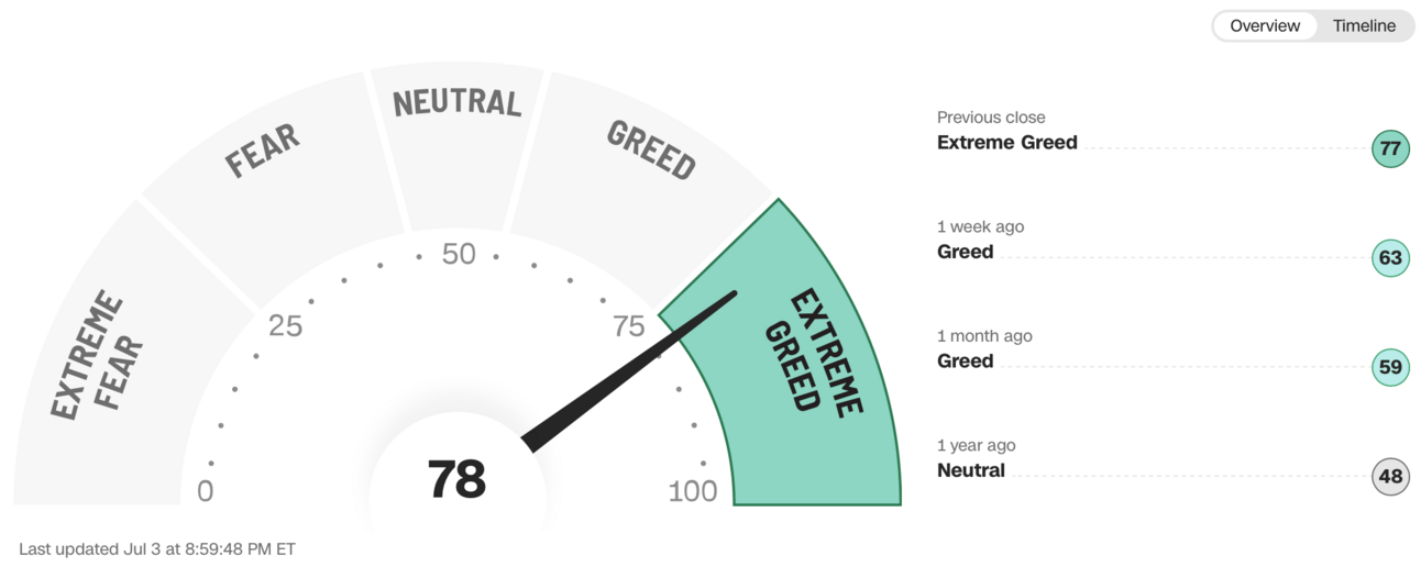 Current read is 78 on the fear greed index vs 65 last week.