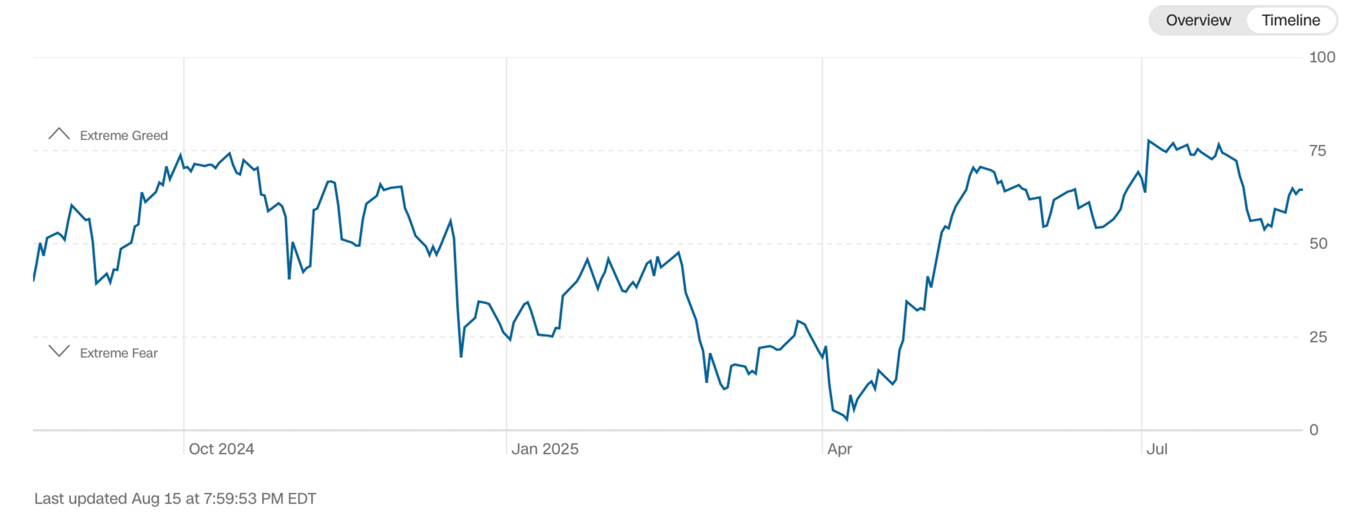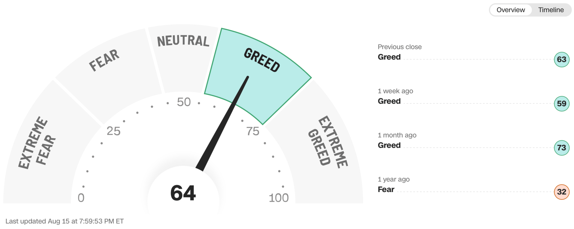 Current read is 64 on the fear greed index vs 59 last week.